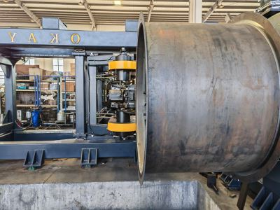 设备是一款具有高度数控集成功能的专用旋压成型,采用卧式数控旋压成型,可通过圆环进行内、外旋压进行风机前盘或者进风口的数控成形,同时通过采用不同的夹具,可采用两旋压轮对直筒桶体进行法兰的翻边、冲孔。翻边轴采用液压控制实现角度及速度控制可进行翻边,工位转化。通过更换不同规格的内模可以实现直径500mm~Ф3000mm(最大法兰外径)的风机外壳的翻边打孔,打孔参数数及翻边的形状尺寸可以在软件上进行设定。另外,涨轴可安装液压涨缩花盘,用于平板翻边、锥体翻边旋压等工艺。